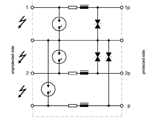 • Nearly leakage current free overvoltage protection device for 3-data or signal lines, 2-wire bus networks