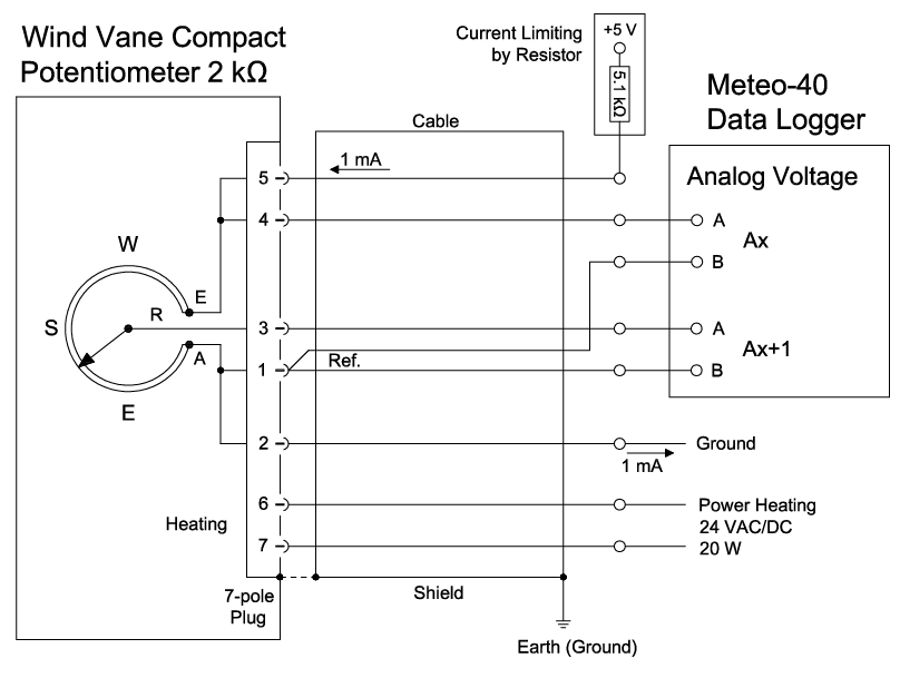 The wind vane can be equipped with an electronically regulated heating system in order to prevent ice from the bearings. To use this heating the connection cable must have additional cores and you should provide a sufficient power supply (mains connection).