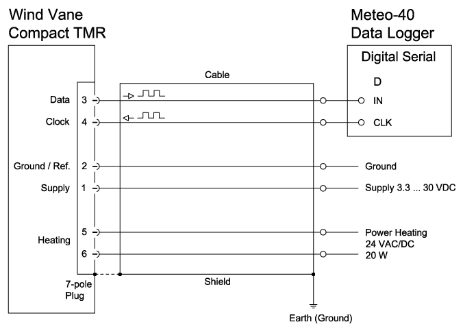 A connected micro-controller calculates from this voltages the wind direction in 1024 sectors (0.35°/sector). Related to sector 1 is the wind direction 0°-35°, sector 1024 corresponds to the wind direction 359.65°-360°.