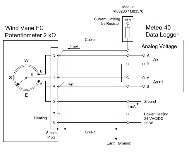 Wiring is compatible to the classic potentiometer wind vane to keep the high precision measuring constellation of the potentiometric wind vane when Ammonit Meteo-40 data logger is used.